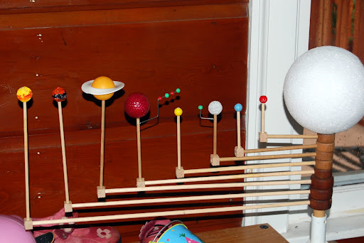 I made this solar system 3d model for my kid. Starting with mercury begin gluing the dowels for each plane to the sun at 1 inch below the rubber band. We have used back ground of cardboard.
